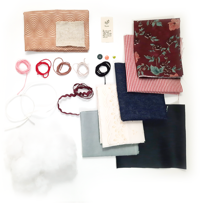 In this kit you will find all the materials necessary to make a bear and its complete wardrobe. Includes the pattern, fabric for his body, a piece of recycled wool sweater for his snout, stuffing and embroidery floss for his face, plus 5 assorted fabrics, faux leather, ribbon, fringe, buttons and embroidery floss to sew his clothes.