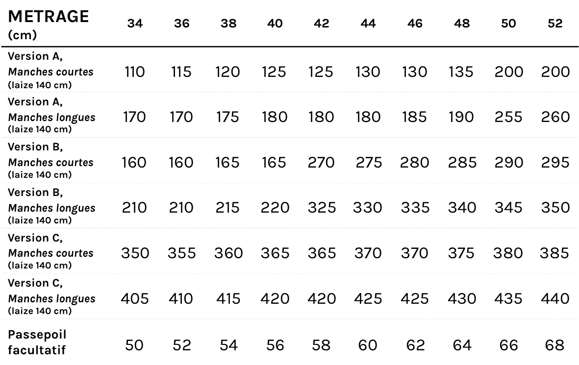 - 10 mm wide elastic ribbon (for dress versions B and C), quantity indicated in the table opposite.