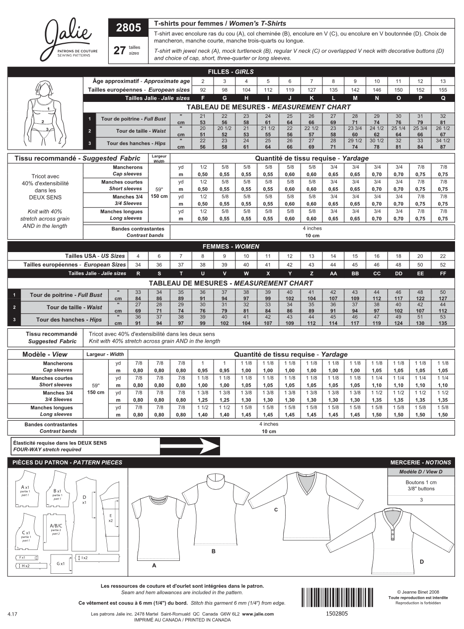 Women's and Girls' T-Shirt 2805 | Paper Pattern - Jalie