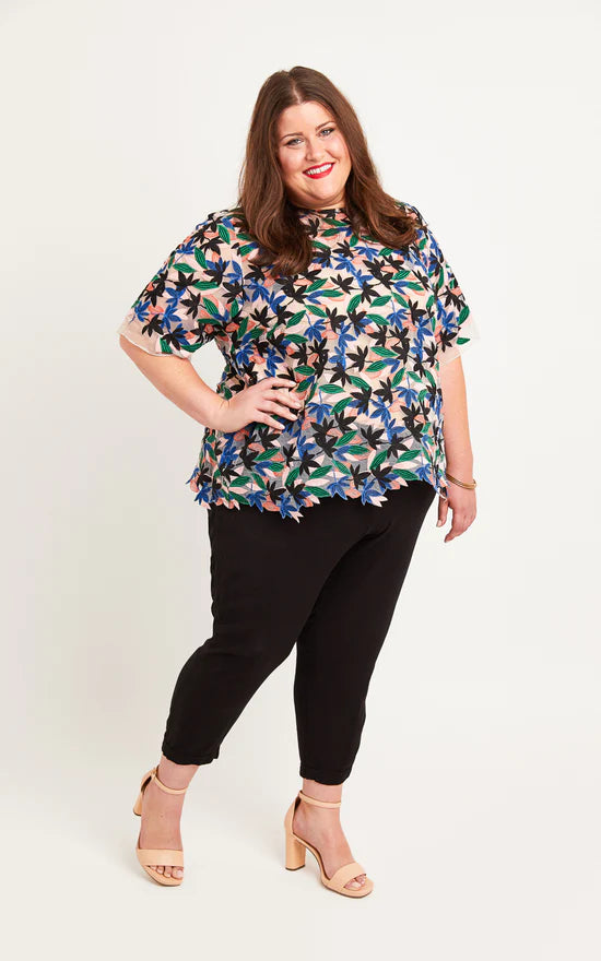 Ce modèle intemporel comporte deux variantes : La vue A est un chemisier à encolure dégagée avec des manches courtes et un empiècement arrière incurvé, tandis que la vue B met en valeur les tissus en dentelle avec un col bijou, des manches aux coudes et un dos en trou de serrure. Que vous choisissiez un tulle délicat et brodé, une dentelle originale ou un voile de coton fleuri, le top Montrose fera fureur !